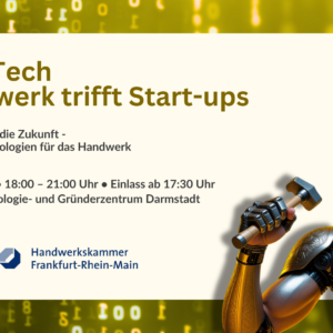 Handwerk trifft Start-ups Zukunft gestalten Moderne Technologien automatisieren Prozesse und steigern die Effizienz. Digitale Werkzeuge und nachhaltige Materialien schaffen neue Geschäftsfelder und machen das Handwerk attraktiver. Start-ups gewinnen Zugang zu jahrzehntelanger Erfahrung, praktischem Wissen und handwerklichen Fähigkeiten, während Handwerksbetriebe frühzeitig Innovationen nutzen und sich Wettbewerbsvorteile sichern. Wann: Donnerstag, 07. Mai 2026, 18:00 – 21:00 Uhr (Einlass… Weiterlesen »Gründungs- und Unternehmenssprechstunde – 2026