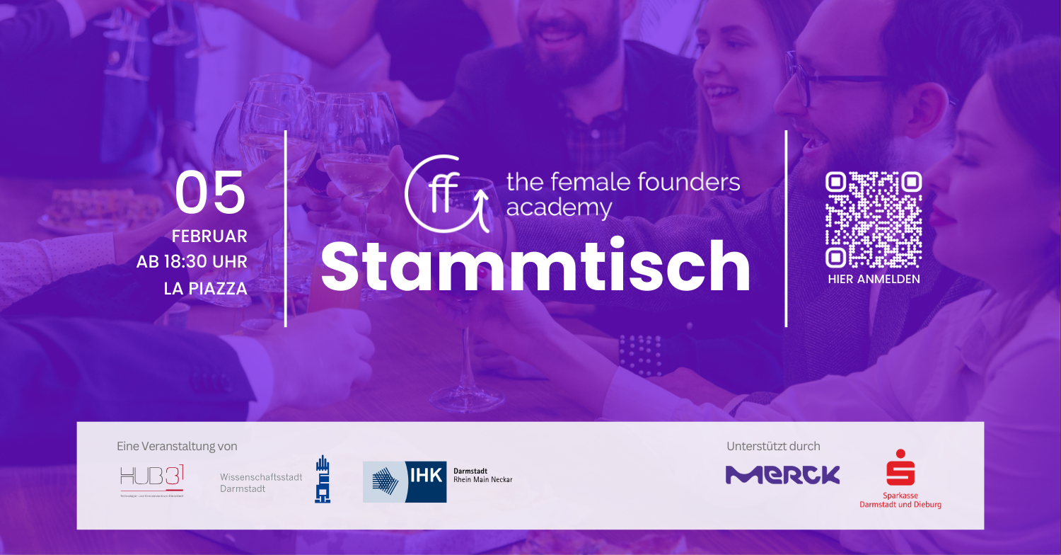 Im Rahmen der female founders academy laden wir herzlich zum 5. Stammtisch am 05. Februar 2026 um 18:30 Uhr im Restaurant La Piazza in Darmstadt. Wir möchten so Gründer:innen, Gründungsinteressierten und Unternehmer:innen die Möglichkeit des Austauschs sowie der Vernetzung geben. Das Event ist selbstverständlich auch für alle Herren offen, wir freuen uns über jeden, der teilnehmen möchte.