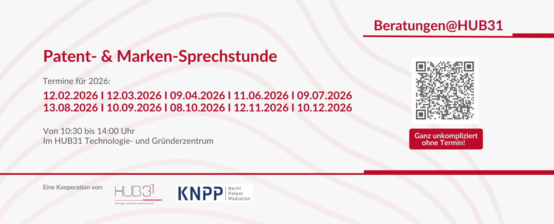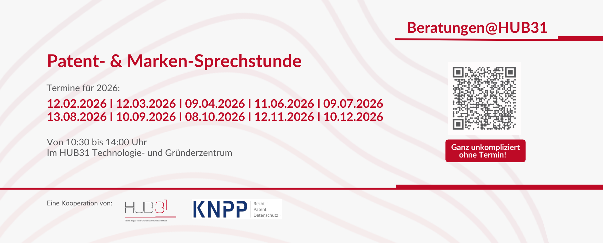 Ab dem 12. Februar 2026 sind die Kolleg:innen von KNPP Rechts- und Patentanwälte PartGmbB regelmäßig mit der Patent- & Marken-Sprechstunde vor Ort im HUB31. Die Beratung findet immer am 2. Donnerstag des Monats ab 10:30 bis 14:00 Uhr statt und lädt ausdrücklich auch zum unverbindlichen Kennenlernen ein – vom kurzen Hallo bis zum langen Austausch.