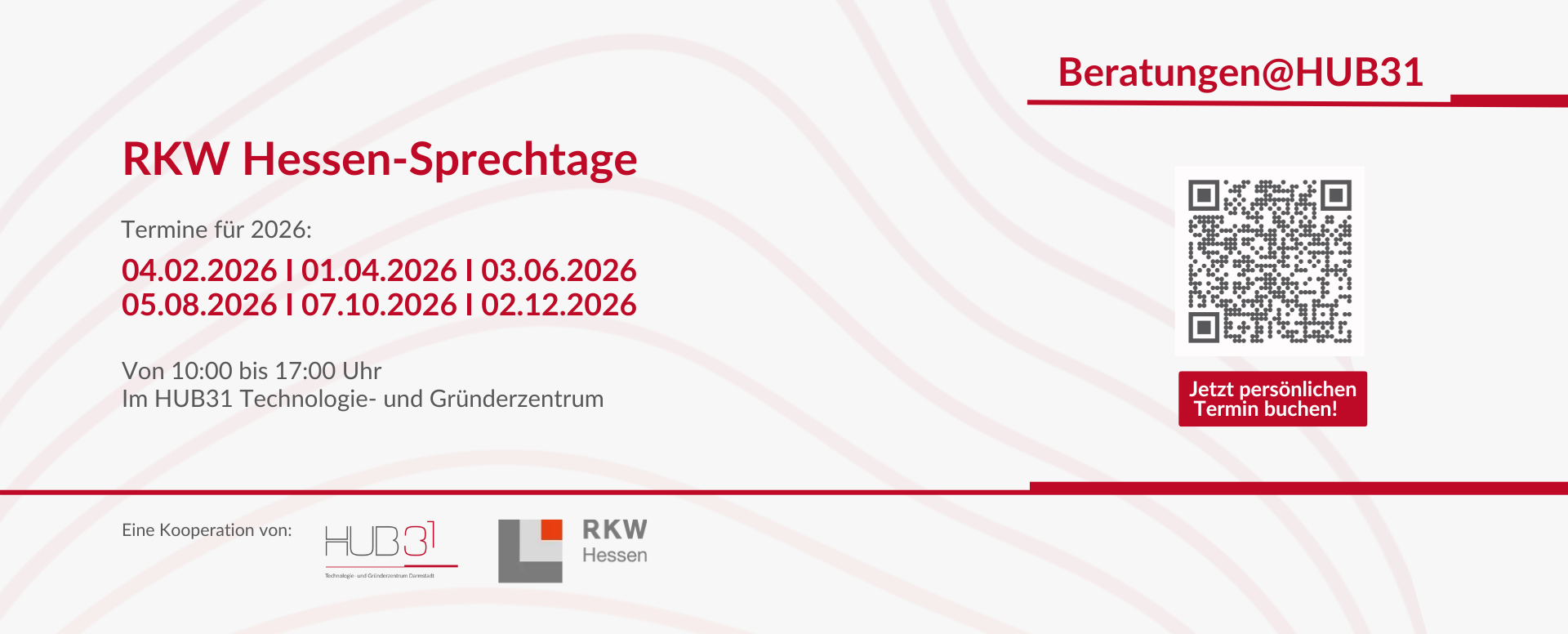 Die Beratungs- und Fortbildungsorganisation RKW Hessen und das HUB31 Technologie- und Gründerzentrum Darmstadt bieten Gründerinnen und Gründern, Firmen-Nachfolgerinnen und -Nachfolgern sowie Unternehmen an folgenden Terminen in 2026 jeweils Sprechtage vor Ort im HUB31 an: