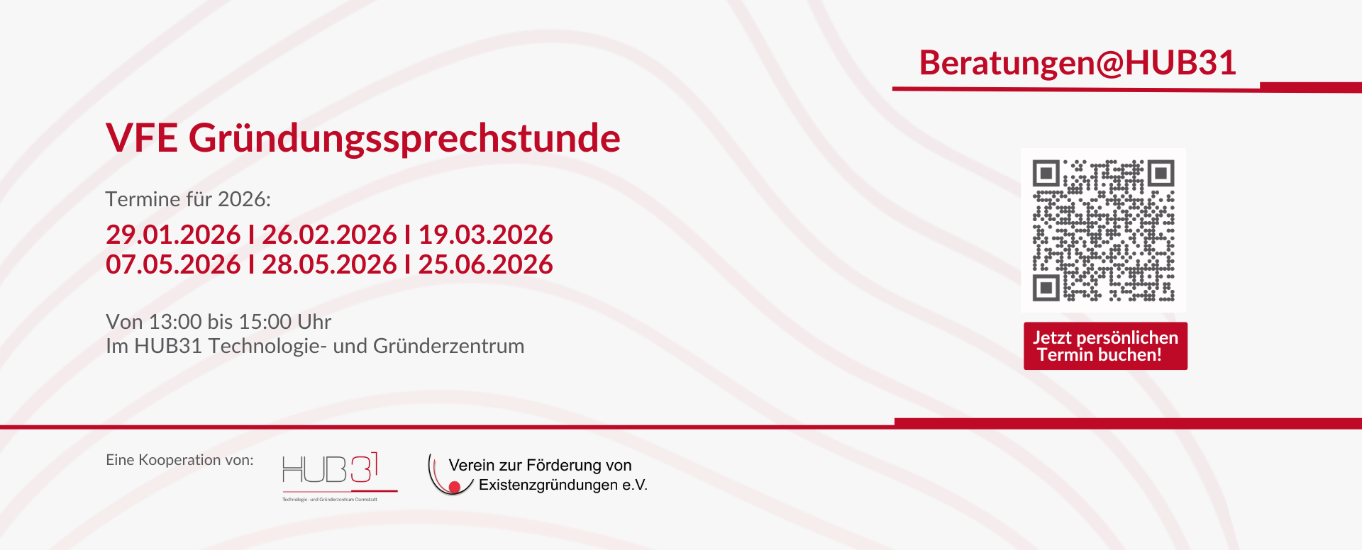 Der Verein für Existenzgründung unterstützt Unternehmer bei der Gründung und in den ersten Jahren nach der Gründung. An folgenden Terminen findet eine Beratung in Kooperation mit dem HUB31 in Darmstadt statt: