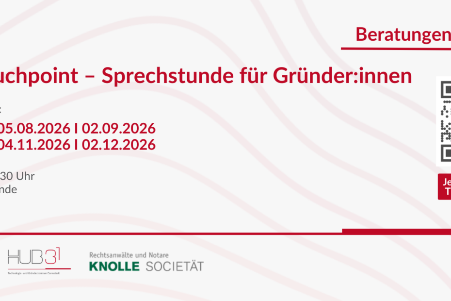 In der monatlichen Online-Sprechstunde „Legal Touchpoint“ erhalten Gründerinnen und Gründer eine praxisnahe rechtliche Erst- und Orientierungsberatung zu zentralen Fragen der Unternehmensgründung und der frühen Wachstumsphase. Die Online-Sprechstunde wird von KNOLLE® SOCIETÄT Rechtsanwälte PartGmbB durchgeführt. Thematisch können… Weiterlesen »Legal Touchpoint – Sprechstunde für Gründer:innen – 2026